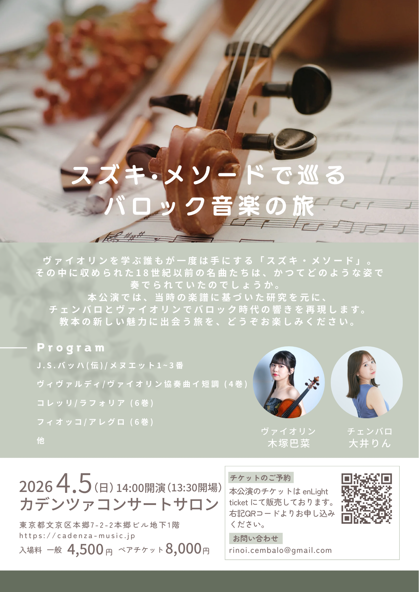スズキ・メソードで巡るバロック音楽の旅 4月5日(日)14:00開演ご予約先:▶︎こちら |